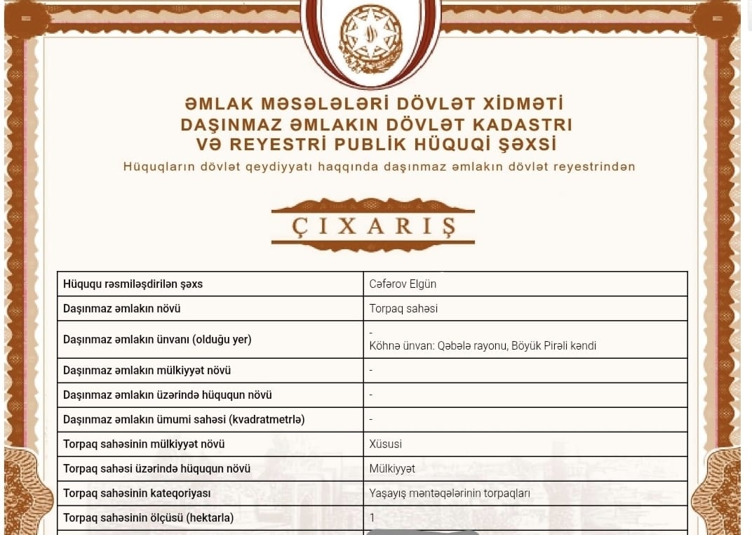 Qəbələnin Böyük Pirəli kəndində, asfalt yolun tam kənarındakı 1 hektar torpaq sahəsi HİSSƏ-HİSSƏ (ƏN AZ 30 SOT) satılır. ???? KAMPANİYALAR: • 50 sot alış zamanı 2 SOT HƏDİYYƏ • Alan şəxs torpaqda ev və ya obyekt tikərsə, əlavə 2 SOT HƏDİYYƏ ???? YERLƏŞMƏ • Asfalt yolun birbaşa kənarı (Bəy yolu) • Əsas magistrala ~ 4 dəqiqə (Ağdaş-Zarağan yolu) • Rayon mərkəzinə ~10 dəq. + Dəmiryolu vağzalına ~12 dəq. • Hər iki tərəfdən yola çıxışı var. ⚡ KOMMUNAL XƏTLƏR • Qaz-işıq-internet xətləri və artezian torpağın yanındadır ???? SAHƏSİ VƏ QİYMƏTİ • 100 sot rəsmi çıxarışlı + 30 sot zəbt • Sahə düzbucaqlı formadadır • HİSSƏ- HİSSƏ SATILIR • Kupçalı hissə – 1450 Azn ???? SƏNƏDLƏR • Torpaq TİKİNTİ təyinatlıdır. • Yeni çıxarış/kupça (2026-cı il) ???? ƏLAVƏ GƏLİR • Ərazidə məhsuldar 100 fındıq ağacı var • Fındıq bağının illik gəlirliliyi yüksəkdir